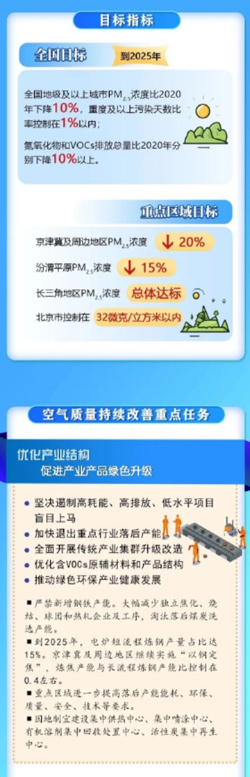答:《行动计划》全面对接、充分吸纳《国民经济和社会发展第十四个五年规划和2035年远景目标纲要》《中共中央 国务院关于深入打好污染防治攻坚战的意见》《“十四五”生态环境保护规划》中提出的空气质量改善相关目标指标,细化分解落实,以PM2.5污染控制为核心,大力推动氮氧化物和VOCs减排,提出“到2025年,全国地级及以上城市PM2.5浓度比2020年下降10%,重度及以上污染天数比率控制在1%以内;氮氧化物和VOCs排放总量比2020年分别下降10%以上。京津冀及周边地区、汾渭平原PM2.5浓度分别下降20%、15%,长三角地区PM2.5浓度总体达标,北京市控制在32微克/立方米以内。”