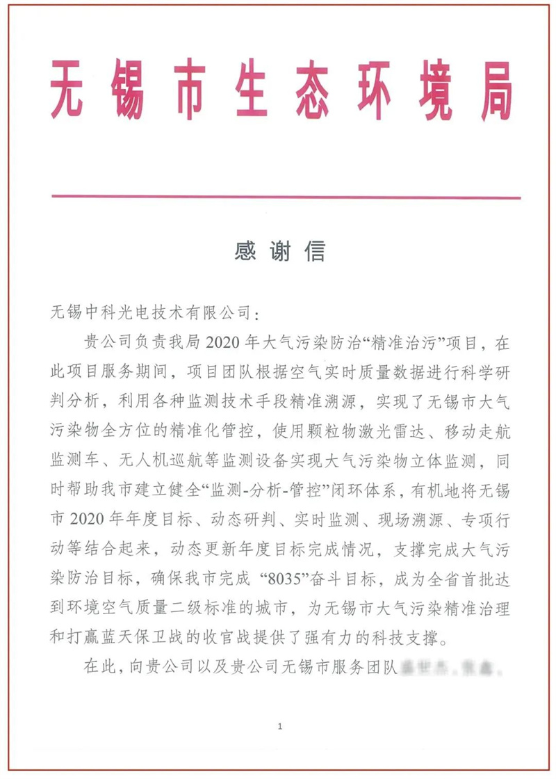 2020年至今,省打好污染防治攻坚战指挥部办公室连续向无锡市委、市政府发来贺信、感谢信,为无锡市的污防攻坚战绩点赞;无锡中科光电项目团队的持续努力为无锡市贡献了越来越多的蓝天,客户的肯定和信任激励着团队再接再厉、奋战新征程!