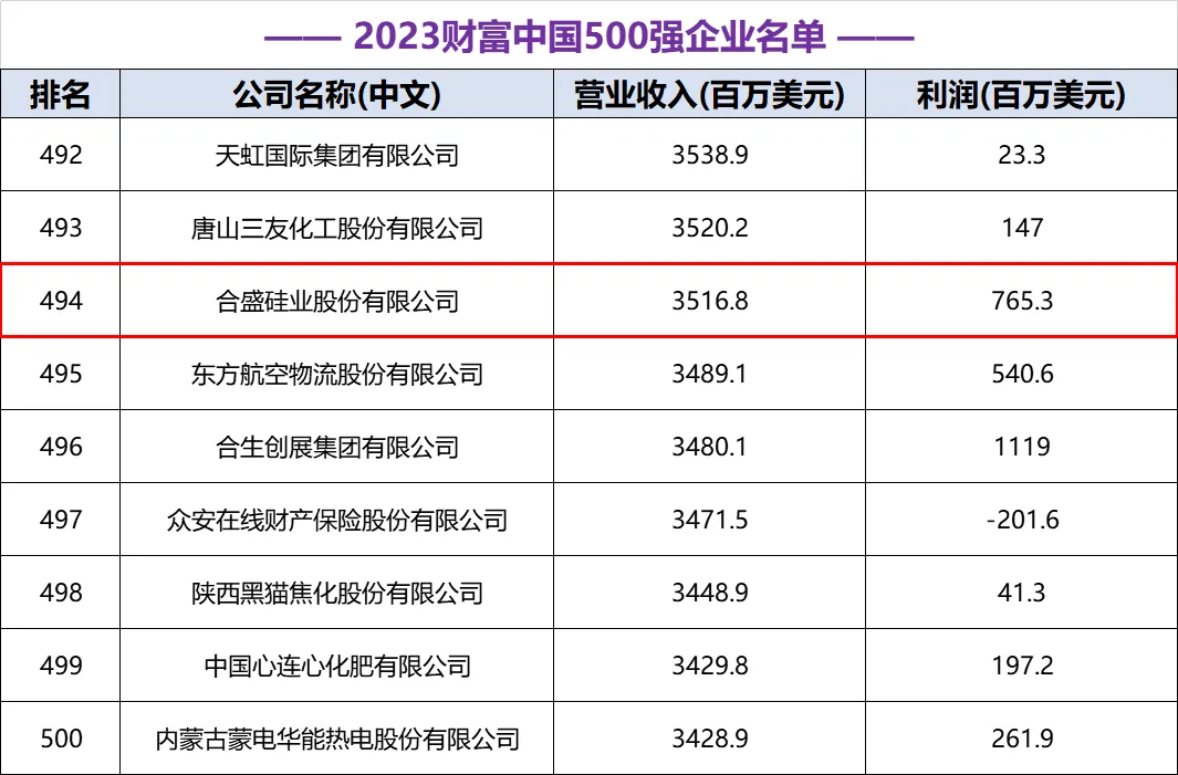 近日,财富中文网发布2023年《财富》中国500强排行榜,合盛硅业凭借持续稳定的盈利能力、高质量的经营管理体系,位列榜单第494位,在利润率细分榜单中排名第34名,这也是合盛硅业首次上榜《财富》中国500强。